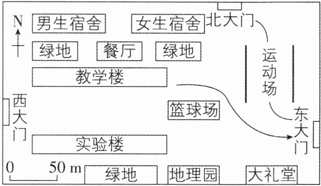 (2)图中比例尺表明图上距离 1 厘米代表实地距离 50 米,从男生宿舍楼到大礼堂的图上距离约为 6 厘米,则实地距离约 300 米,若保持 60 米/分钟的速度步行,约需 300 米÷60 米/分钟=5 分钟。