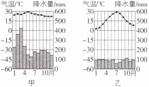 7.B 【解析】由图可知,甲是全年高温多雨的热带雨林气候,主要分布在赤道附近;乙是冬无严寒,夏无酷暑,一年内降水均匀的温带海洋性气候,主要分布在中纬度地区的大陆西岸;乙地的最热月平均气温出现在7月前后,乙地位于北半球。甲、乙两种气候在中国都没有分布。故选 B。