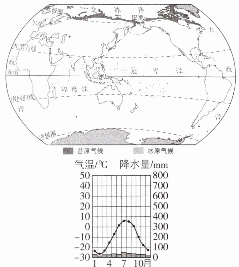 [2025河南新乡期中]某小组同学在老师的帮助下,了解到寒带气候主要分布在南、北极圈以内。下图为该小组同学查阅到的寒带气候分布图和巴罗气温年变化曲线和逐月降水量图。读图,完成4~5题。