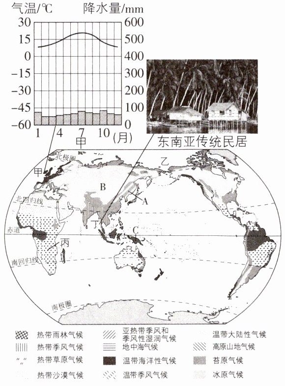 (4)请描述丁地传统民居特点,并说明其与当地气候的关系。(提示:写出民居特点,并说明其与当地气候的关系,民居特点主要从屋顶坡度的陡缓、墙体的薄厚、窗户的大小,建筑结构及材料等方面作答,其与气候的关系主要结合当地气温、降水两方面思考)