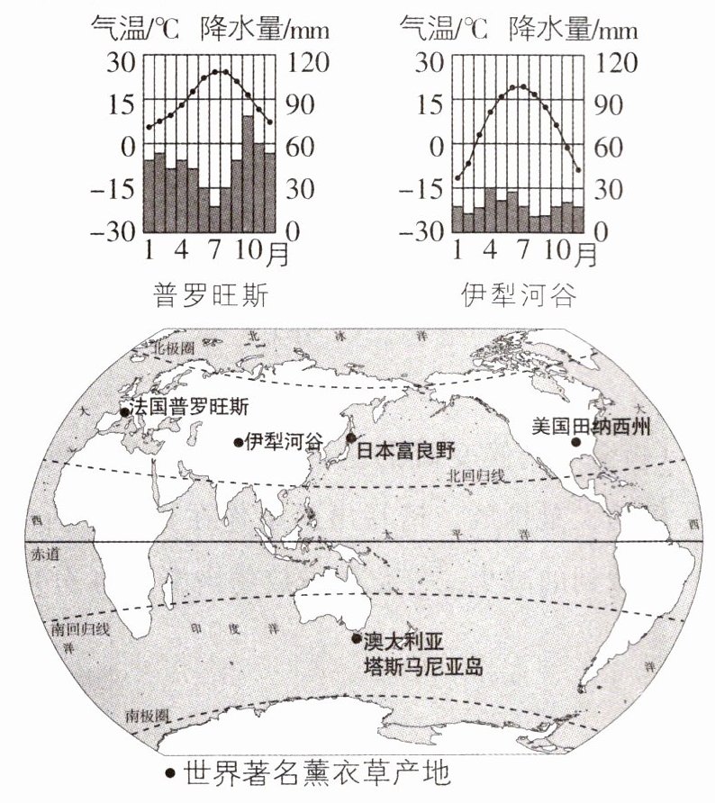教材外区域综合设题 [2024广东茂名期末]薰衣草原产于地中海地区,6—7月花期时要有充足的阳光,耐旱怕湿,我国新疆伊犁河谷是世界薰衣草三大种植基地之一。下图为普罗旺斯及伊犁河谷气候资料图和世界著名薰衣草产地分布图,完成11~12题。