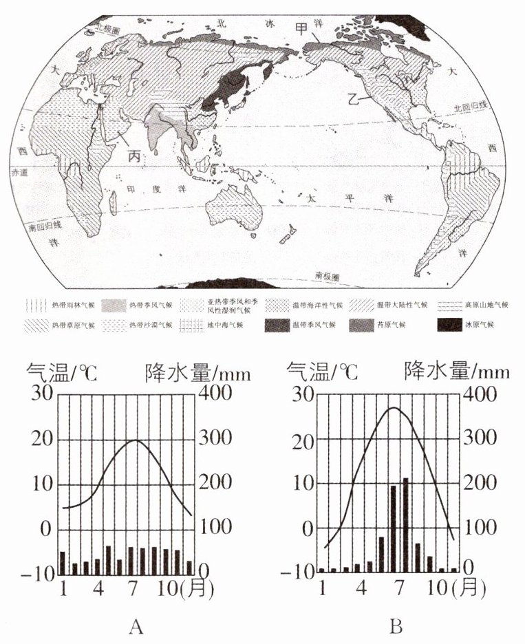 (1)读图并根据所学知识可知,位于欧洲西部的英国伦敦属于温带海洋性气候,全年温和湿润。A所示的是温带海洋性气候,B所示的是温带季风气候,故选A。