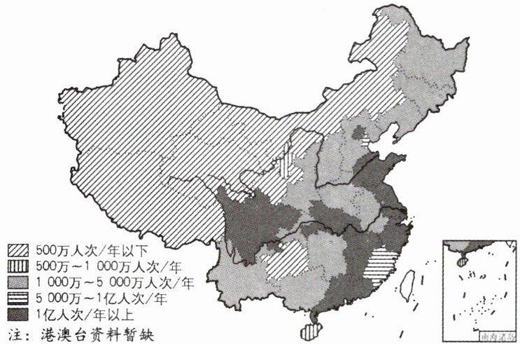 (1)以黑龙江省黑河至云南省腾冲为界,我国人口呈现东部密集、西部稀疏(东多西少)的分布特点。图中接近我国人口界线的是"500万人次/年以下"与"1000万~5000万人次/年"的分界线。易错警示 我国人口最多的民族是汉族,但人口最多的少数民族是壮族,在审题时注意设问考查的是我国的民族还是我国的少数民族。
