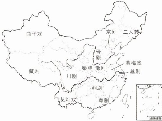 新考向传统文化[2024新疆中考]“小舞台,大智慧”,中国戏曲源远流长,种类繁多,百花齐放。读我国部分地方戏曲分布图,完成4~5题。