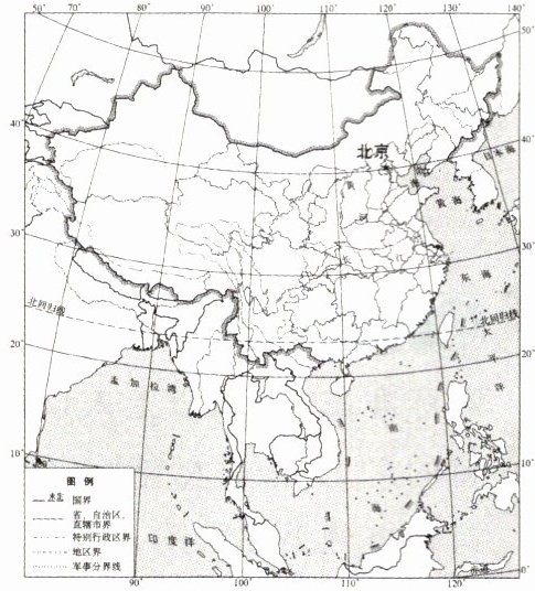 [2024江苏宿迁中考]“你见过什么样的中国?是960万平方千米的辽阔,还是300万平方千米的澎湃?是四季轮转的天地,还是冰与火演奏的乐章?”这是纪录片《航拍中国》的片头。上图为中国疆域示意图。据此,完成1~3题。