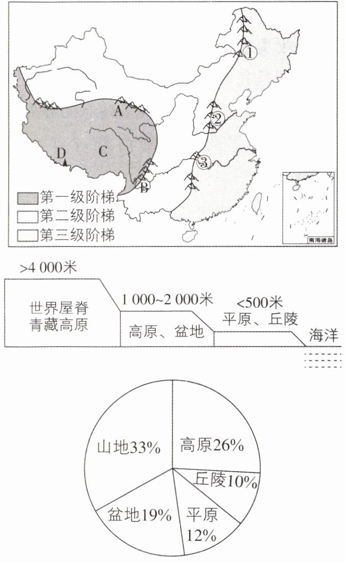 6 读中国地势三级阶梯图和地形类型面积比例示意图,完成下列问题。