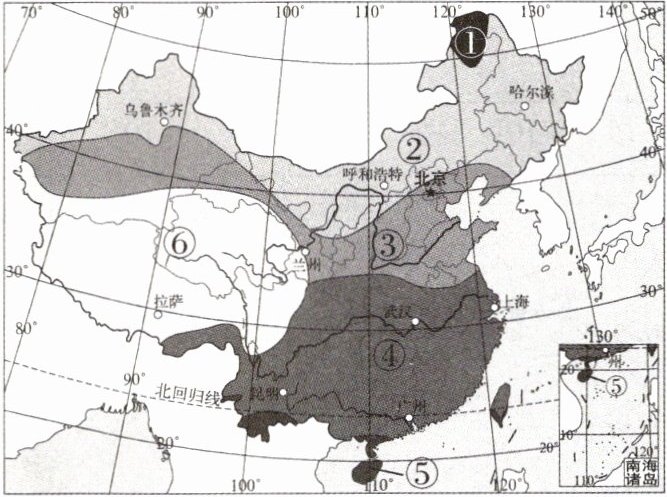 4.热带 亚热带 暖温带 中温带 寒温带 高原气候区 (画图略)