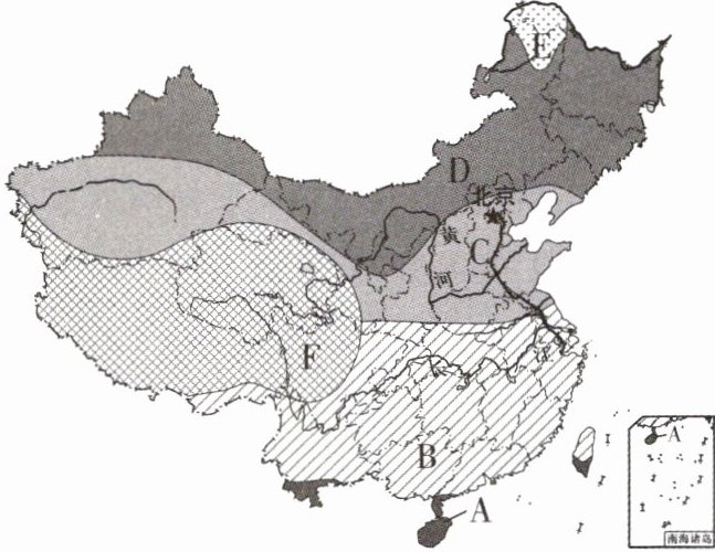 4读中国的温度带分布图,在下列横线上填写图中字母代表的温度带名称,并画出秦岭—淮河线。