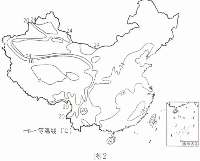 [2025江苏宿迁期中]图1为中国1月份平均气温分布图,图2为中国7月份平均气温分布图。据此完成1~2题。