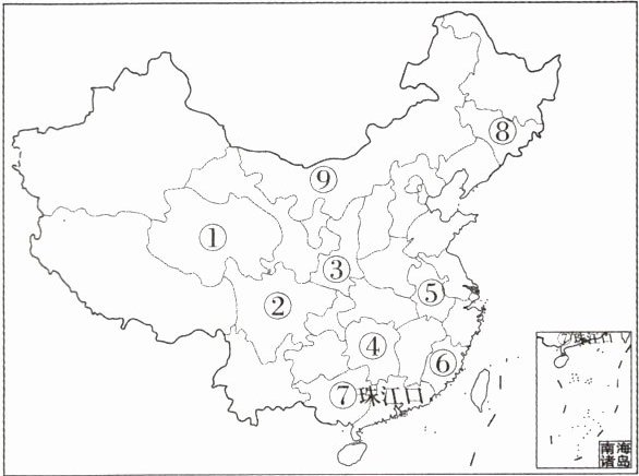 (3)写出下列序号所代表的省级行政区域单位的行政中心:⑦____,⑧____,⑨____。⑦⑧⑨三个省区中,东西跨经度最广的是____(写出省级行政区域单位的全称)。