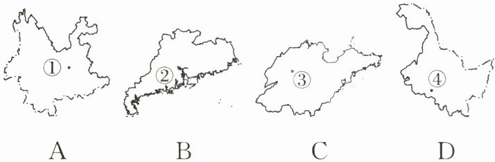 D 【解析】根据轮廓图可以判断,①是云南省,②是广东省,③是山东省,④是黑龙江省。我国最东端在黑龙江与乌苏里江主航道中心线的汇合处,最北端在黑龙江省漠河市北端的黑龙江主航道中心线上,都在④黑龙江省,D正确。故选D。
