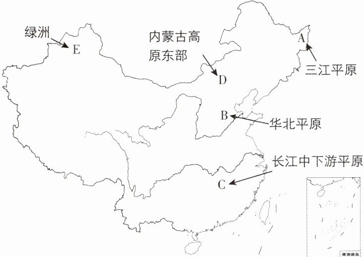 (2)A 地为三江平原地区,适合发展种植业;D 地为内蒙古高原东部,适合发展畜牧业;E 地位于新疆维吾尔自治区,适合发展绿洲农业。形成这三地农业类型差异的主要气候因素是降水。
