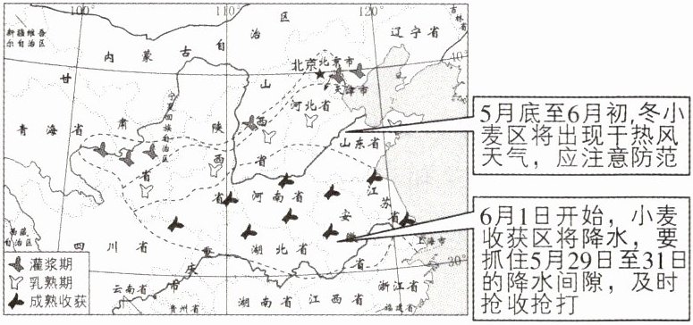 [2025 广东广州期中,中]小麦生长的后期阶段分为灌浆期、乳熟期、成熟收获三个时段,这时麦田的颜色也由原来的绿色渐渐变成金黄色。读图,完成 1~3 题。