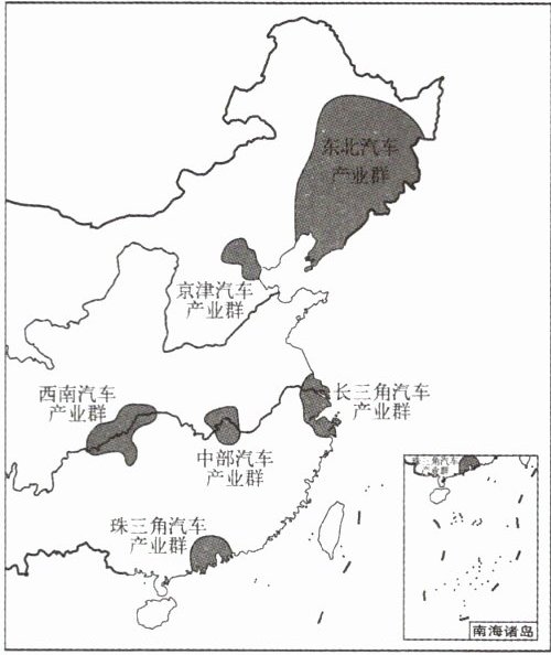 2.D 【解析】由图可知,我国汽车工业分布特点是主要沿长江分布和沿海分布。故选 D。3.A 【解析】京津汽车产业群所在的工业区是京津冀工业区,是我国北方最大的综合性工业区,这里工农业用水量大,水资源是制约其发展的主要因素。故选 A。