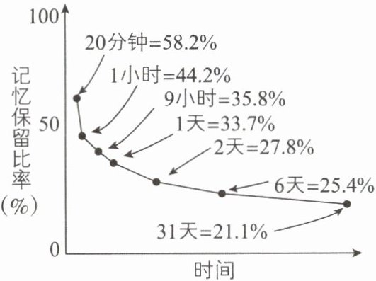11.C 【解析】本题考查科学的学习方法。艾宾浩斯遗忘曲线反映了人的记忆保留比率与时间成反比,时间越久,残留的记忆部分就越少,告诉我们一定要及时复习,巩固记忆,C正确;A、D不符合题意,排除;我们要及时复习,不仅是课堂上,课下也要不断巩固知识,B排除。