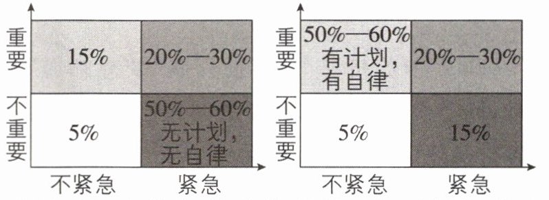 5.C 【解析】本题考查合理规划初中生活。低效是因为无计划、无自律,没有体现对学习缺乏兴趣,A排除;高效是因为有计划、有自律,没有体现合作学习,B排除;观察图片可以看出,高效者更懂得合理规划时间,C正确;低效者应合理安排时间,学会自律,D排除。