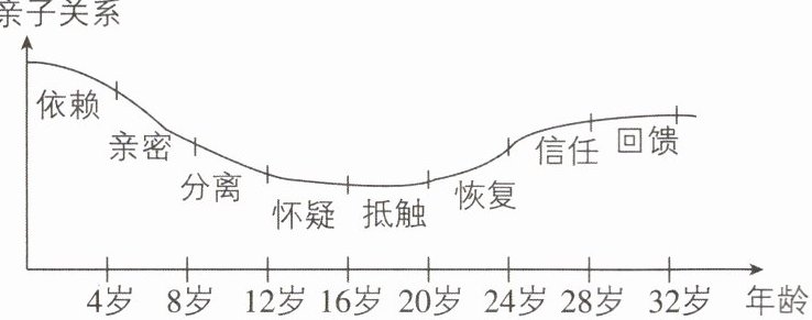 C 【解析】本题考查建设美好家庭。分析图片可知,在青少年阶段,亲子关系较为紧张,这要求我们学会处理亲子关系,承认代沟的存在,积极与父母沟通,试着去接纳父母的做法,理解父母,保持良好心态,积极主动化解冲突,A、B、D 做法正确;“拒绝父母的教导,坚持自己的个性”不利于中学生的健康成长,也不利于建立良好的亲子关系,C 做法错误。本题为逆向选择题,故选 C。