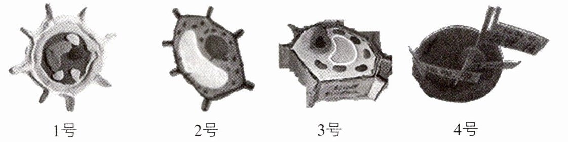 如图分别是四个小组用一种无毒无味的橡皮泥为主要材料制作的植物细胞模型,除了1号模型,请你任选两个,根据上述老师的建议并参考1号模型评价要点,进行评价。