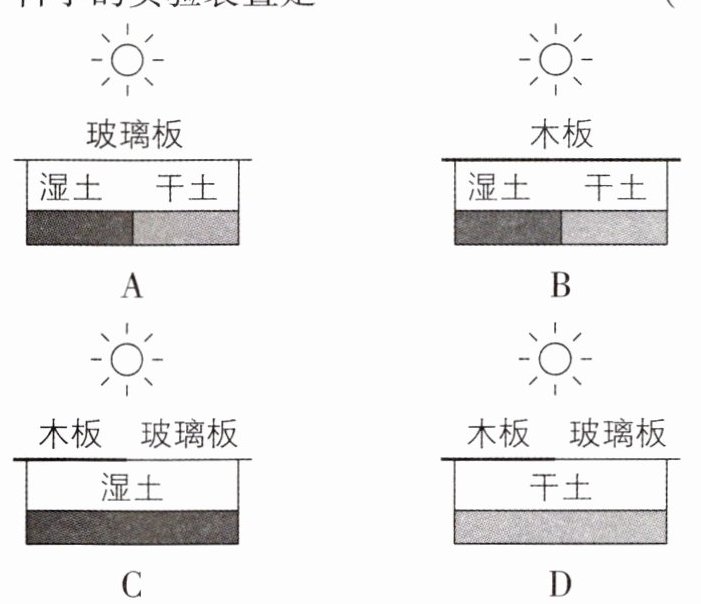 B 【解析】对照实验要遵循单一变量原则。探究湿度对鼠妇生活的影响时,实验的唯一变量是湿度,其他条件应该相同且适宜。鼠妇喜欢生活在阴暗的环境中,A 中玻璃板透光,光会影响鼠妇的生活;C、D 中变量是光的有无。故选 B。