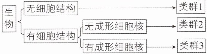 C 【解析】制作酸奶时用到的微生物是乳酸菌,无成形的细胞核,属于类群 2,即细菌,A 正确。类群 3 是有成形的细胞核的生物,既有单细胞生物,如草履虫、衣藻、酵母菌等;又有多细胞生物,如月季、羊等,B 正确。类群 3 可以是真菌、动物或绿色植物等,其中真菌和动物不能直接利用无机物制造有机物,绿色植物能直接利用无机物制造有机物,C 错误。类群 1 是无细胞结构的生物,是病毒,D 正确。