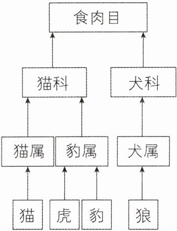 C 【解析】由题图可知,虎和狼同目,有一定的亲缘关系,A 错误。生物分类单位从大到小依次是界、门、纲、目、科、属、种,因此题图中最大的分类单位是目,B 错误。由题图可知,猫和虎同属于猫科,C 正确。由题图可知,虎与豹同属,相似程度较大,D 错误。