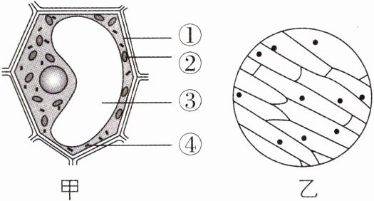(2)细胞结构中容易被碘液染成深色的结构是细胞核。图乙细胞中的小黑点是细胞核。