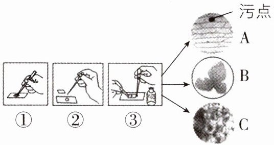 D 【解析】制作植物细胞临时装片的实验步骤简要概括为擦、滴、撕、展、盖、染。制作人的口腔上皮细胞临时装片的步骤简要概括为擦、滴、漱、刮、涂、盖、染。图中,①展(涂)、②滴、③染,故制作动、植物细胞临时装片,正确的操作顺序是②①③,A 错误。B 细胞是人的口腔上皮细胞,步骤②中滴加的液体是生理盐水,B 错误。黄瓜表层果肉细胞呈绿色,观察时无需进行③染,C 错误。在显微镜下看到的是上下、左右均颠倒的物像,A 中污点在视野的上方,要使装片上的污点快速移出视野,装片应该向下方移动,D 正确。