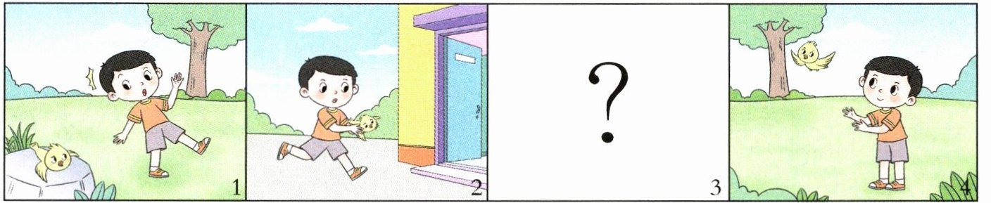 示例:亮亮正兴致勃勃地在野外观察植物,忽然,他看见一块石头上趴着一只小鸟。他停下脚步,好奇地走近看,发现那只小鸟的翅膀受伤了,趴在石头上无法飞起来。亮亮急忙捧起小鸟,快步往家跑去,请妈妈帮忙处理小鸟翅膀上的伤口。亮亮还拿出面包给小鸟吃。等小鸟养好了伤,亮亮就把小鸟带到野外放飞了。小鸟扑打着翅膀,好像在说:“谢谢你,亮亮!”