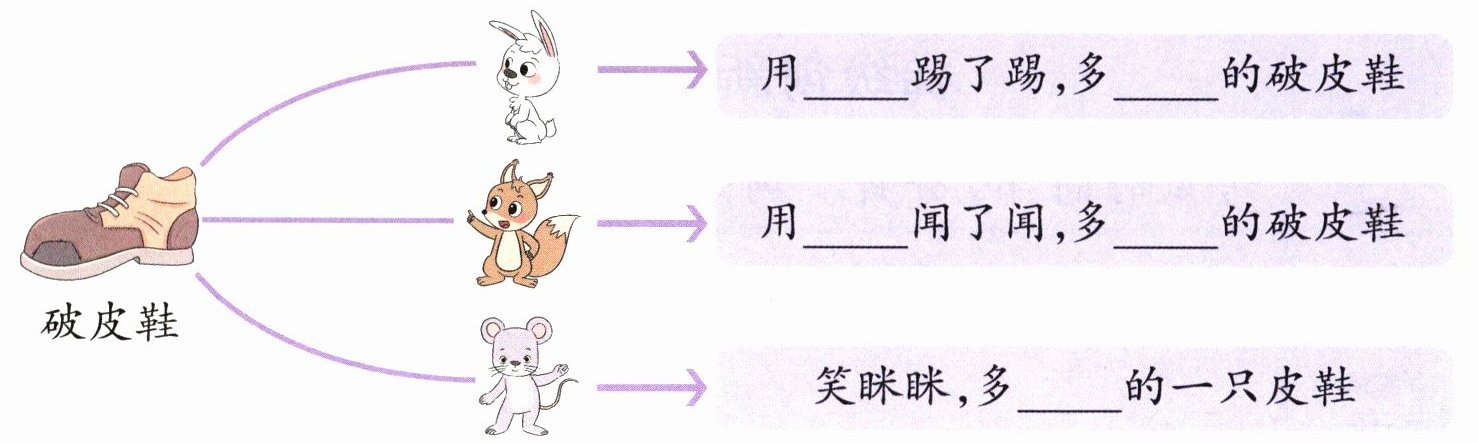 1. 示例:(1)绿油油 白花花 (2)高高兴兴 红红火火 2. 脚 脏 鼻子 臭 好 3. 他提来一桶水,把皮鞋洗得干干净净,又给鞋子刷上油漆,安上四个轮子,把皮鞋改装成车子。 4. 小白兔 小松鼠 5. 示例:我最喜欢小老鼠,因为他不仅爱动脑、勤快、聪明,还乐于助人。他用自己的双手把脏脏的破皮鞋变成漂亮的皮鞋车,开着皮鞋车送小白兔上学,给小松鼠送果子。