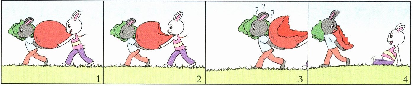 示例:秋天到了,萝卜丰收啦!小白兔和小灰兔一起收萝卜。他们在萝卜地里选了一个最大的萝卜,抬着回家。小灰兔走在前面,小白兔走在后面,走着走着,小白兔看着眼前的萝卜,馋得直流口水。他再也忍不住了,心想:这么美味的萝卜,我就咬一口。小白兔咬了一口,真好吃!他忍不住又咬了一口。他越吃越想吃,就一边走一边大口大口地吃着。过了一会儿,小灰兔觉得背上的萝卜越来越轻了。他回头一看,大萝卜只剩下一点点,再看看小白兔,正挺着一个圆鼓鼓的大肚子坐在地上动弹不得。小灰兔生气地说:“你怎么可以一个人把大萝卜吃得只剩一点点呢?”小白兔低着头说:“对不起,我错了!”