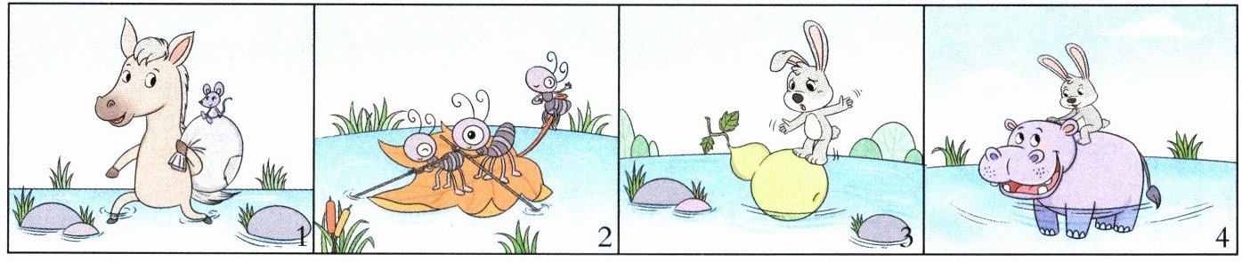 示例:一天,天气晴朗,小动物们都出来游玩。小老鼠、三只小蚂蚁和一只小兔都想要过河,到河对面去找小伙伴玩耍。小老鼠坐在小马背着的布袋上,轻轻松松地过了河。三只小蚂蚁把树叶当船,撑着树叶船过了河。小兔站在葫芦上过河,可是刚到河中间,葫芦就翻了,小兔掉进了河里。这时,河马快速游了过来,把小兔驮出水面,并送它到河对岸。小兔十分感激河马。
