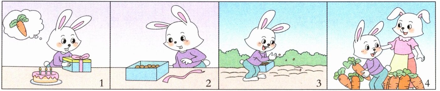 示例:小兔过生日时,收到了一份神秘的礼物——一个漂亮的盒子。“盒子里装的是什么呢?不会是我最爱吃的胡萝卜吧?”小兔一边这样想着,一边兴奋地打开盒子。一看,哪有什么胡萝卜呀,是满满一盒胡萝卜种子。