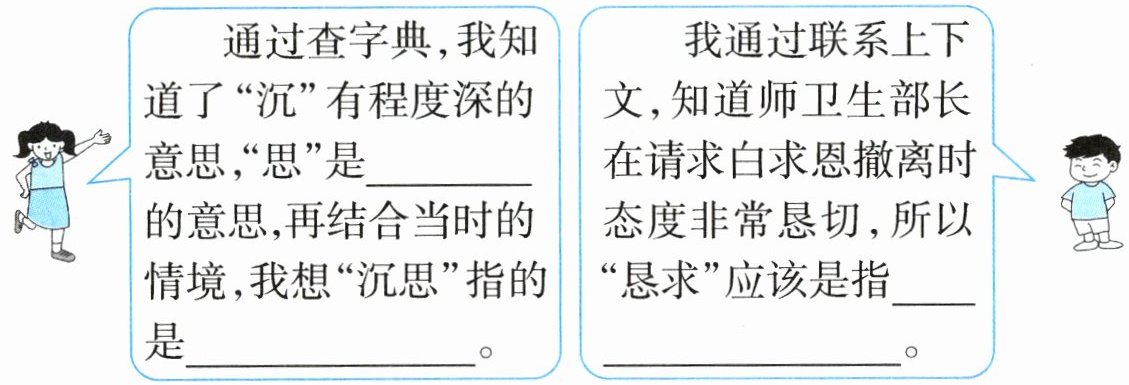 1. 新思维思辨表达 两位同学分别用不同的方法来理解选文中的词语,请你把他们的对话补充完整。(3 分)