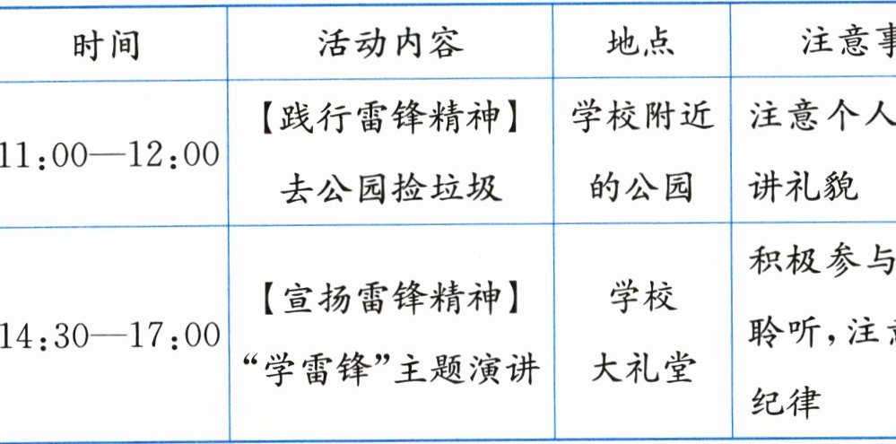 |11:00—12:00|【践行雷锋精神】去公园捡垃圾|学校附近的公园|注意个人安全,讲礼貌|