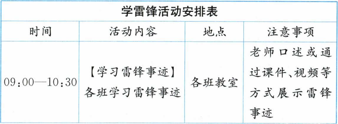 |09:00—10:30|【学习雷锋事迹】各班学习雷锋事迹|各班教室|老师口述或通过课件、视频等方式展示雷锋事迹|