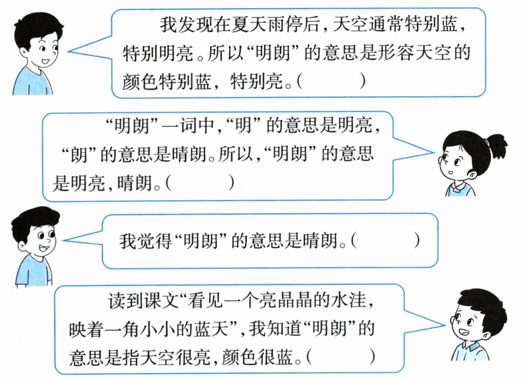 我发现在夏天雨停后,天空通常特别蓝,特别明亮。所以“明朗”的意思是形容天空的颜色特别蓝,特别亮。( )