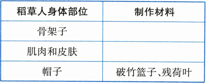 1. 稻草人是农人亲手做的,请阅读选文第①自然段,完成表格。