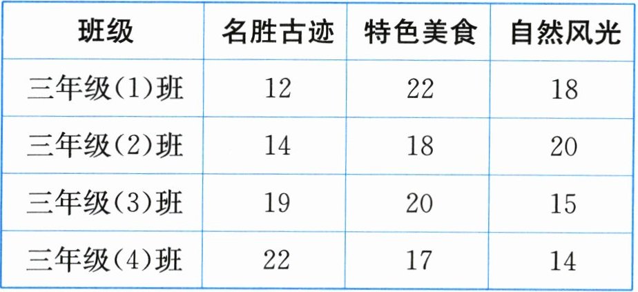三年级在9月份准备开展一次秋游活动,分为“名胜古迹”“特色美食”“自然风光”三个小组引导同学们游玩。阅读报名结果统计表,完成练习。