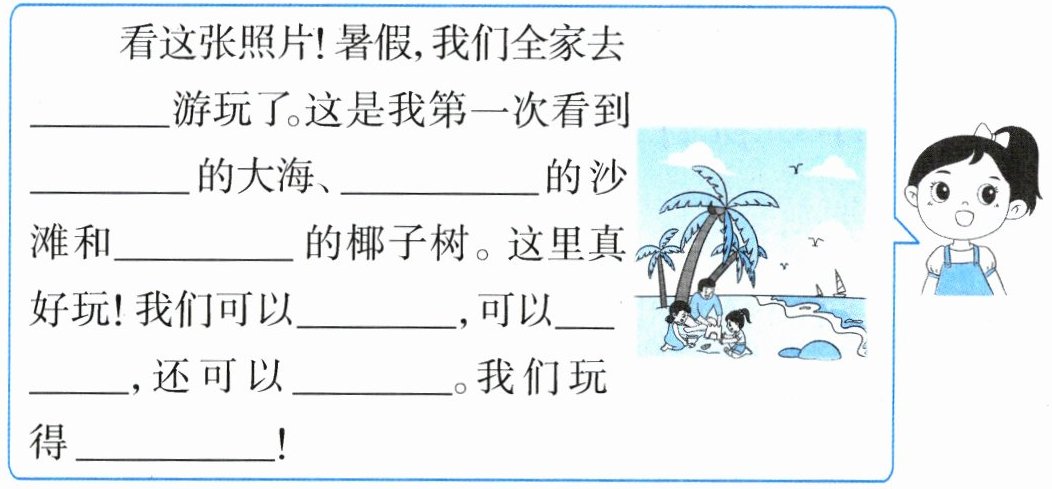 看这张照片!暑假,我们全家去 游玩了。这是我第一次看到 的大海、 的沙滩和 的椰子树。这里真好玩!我们可以 ,可以 ,还可以 。我们玩得 !
