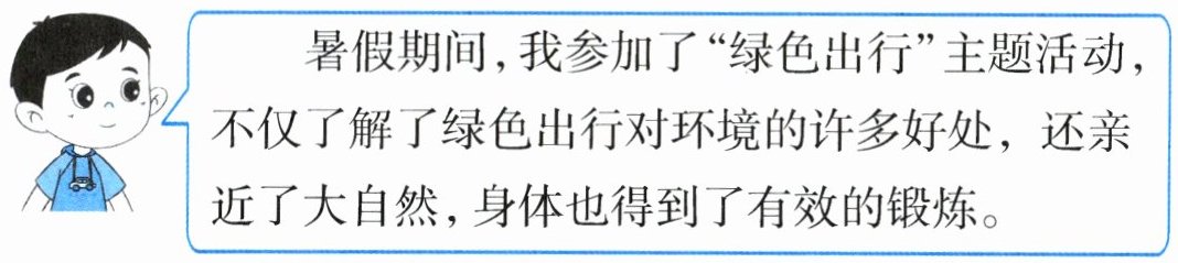 暑假期间,我参加了“绿色出行”主题活动,不仅了解了绿色出行对环境的许多好处,还亲近了大自然,身体也得到了有效的锻炼。
