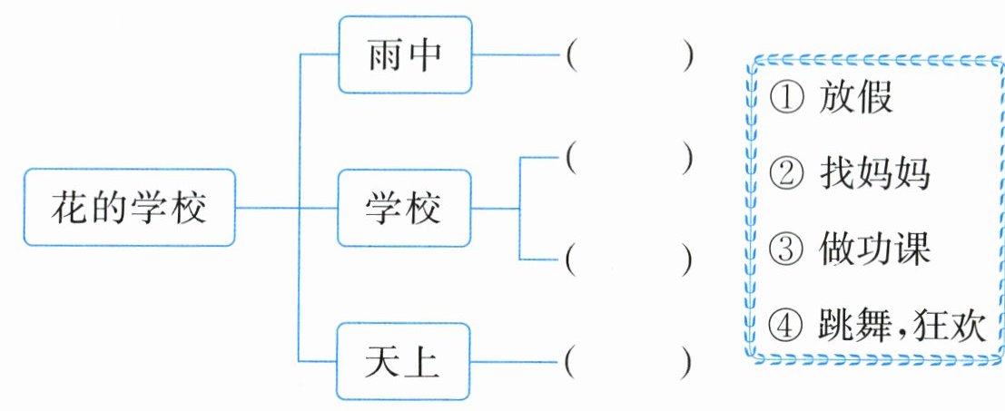 1. 根据《花的学校》一文的内容选一选,完成下面的思维导图。(填序号)(2分)