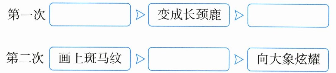 1. 示例:小猪摔倒了 上文斑马的话"你是一只踩着高跷摇摇晃晃的小猪"和"但是没走多远",说明小猪会摔倒 2. "嗨!"小猪跟大象打招呼,"我是一只了不起的斑马! 你看,我身上有斑马纹。" ② 3. 第一次:踩着高跷 向斑马炫耀 第二次:变成斑马 4. 示例:小猪在鼻子上绑了一根长长的塑料管,在两只耳朵上绑了两片大树叶,就变成了大象。然后它跺跺脚,又出门去了。 "嗨!"小猪跟袋鼠打招呼,"我是一头了不起的大象! 我能用鼻子喷水。""你不是大象!"袋鼠大笑着说,"你是一只鼻子上绑了塑料管的小猪。" 小猪正想争辩,突然,"阿嚏!"小猪一个喷嚏把鼻子上的塑料管给震掉了…… 5. (示例)小猪垂头丧气地边走边说:"看来做谁也不如做自己开心!"他回到家,脱下所有的伪装,洗了个澡,舒舒服服地躺在自己的床上。他心想:原来,做自己才是最幸福的。 6. 示例:图片上有许多只不同的小猪,有他原本的样子,也有他变成长颈鹿、斑马、大象等的样子。