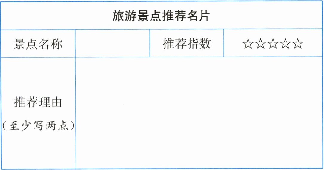 3. 新思维 创意运用 你的家乡有什么值得一去的地方吗?请你选一处为其制作一张名片,向大家推荐吧。(3 分)
