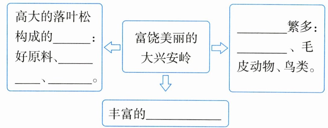 1. 葱葱茏茏 密密层层 严严实实 夏天小兴安岭的树木长得十分茂盛 2. 时间 夏天 秋天 3. D 4. 美丽富饶的大兴安岭多么令人向往,令人自豪啊! 5. 左:林海 好药材 野花 右:动物种类 大型动物 下:地下矿藏 6. 美丽 富饶 热爱和赞美