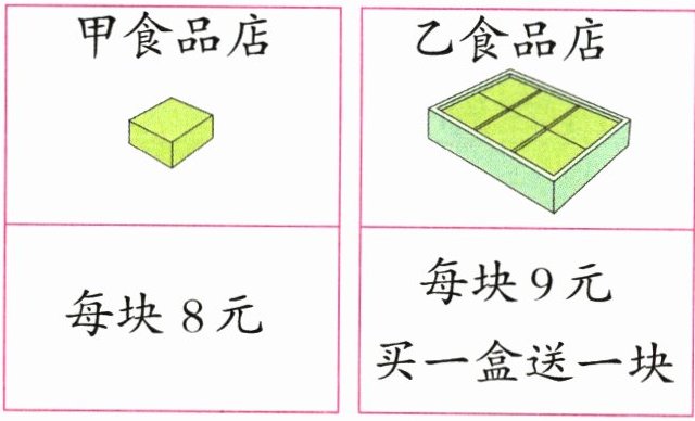 4. (1)小海龟学习到的第三个知识是学会省钱。小海龟想买7块糕点送给自己的好朋友,下面分别是两个食品店的优惠方案,小海龟去哪个食品店买更划算?(8分)