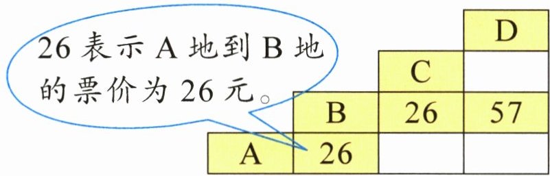 (竖排)52 31 83 [解析:由题图可知,A地到B地的票价为26元,B地到C地的票价为26元,B地到D地的票价为57元。先求A地到C地的票价,A地到C地的票价为A地到B地的票价+B地到C地的票价,即26+26=52(元)。再求C地到D地的票价,因为B地到D地的票价为B地到C地的票价+C地到D地的票价,因此C地到D地的票价为57-26=31(元)。最后求A地到D地的票价,可以用A地到B地的票价+B地到D地的票价,列式为26+57=83(元),也可以用其他方法解答。]