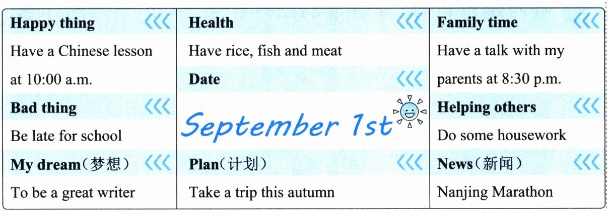 ①Have a talk with my parents ②Be late for school ③Have a Chinese lesson