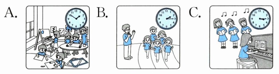 )1. A. At eleven fifteen. B. It's eleven fifteen. C. I have fifteen.(