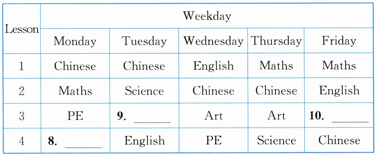 1. Monday 2. lessons 3. Maths 4. about 5. English 6. How 7. many 8. PE 9. Music 10. Science
