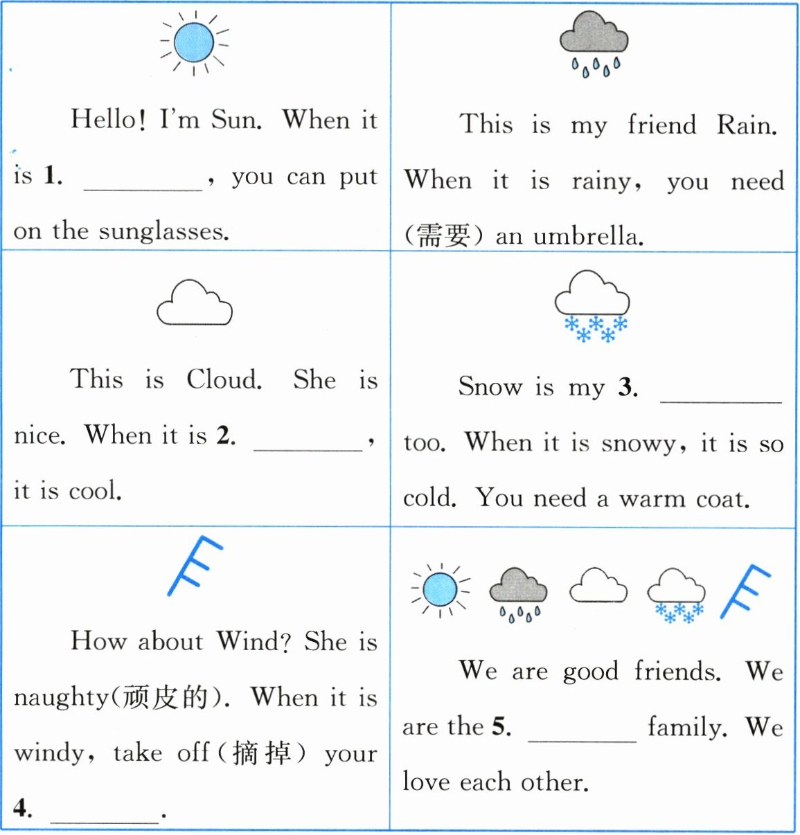 )2. 为绘本选择合适的标题:______。A. The Weather Report B. My Story C. The Weather Family